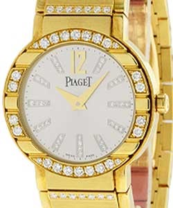 Piaget Polo Current Style Lady's 18 K Yellow Gold on bracelet with diamond bezel or plain bezel with various dials. Quartz movement. 28 mm case.