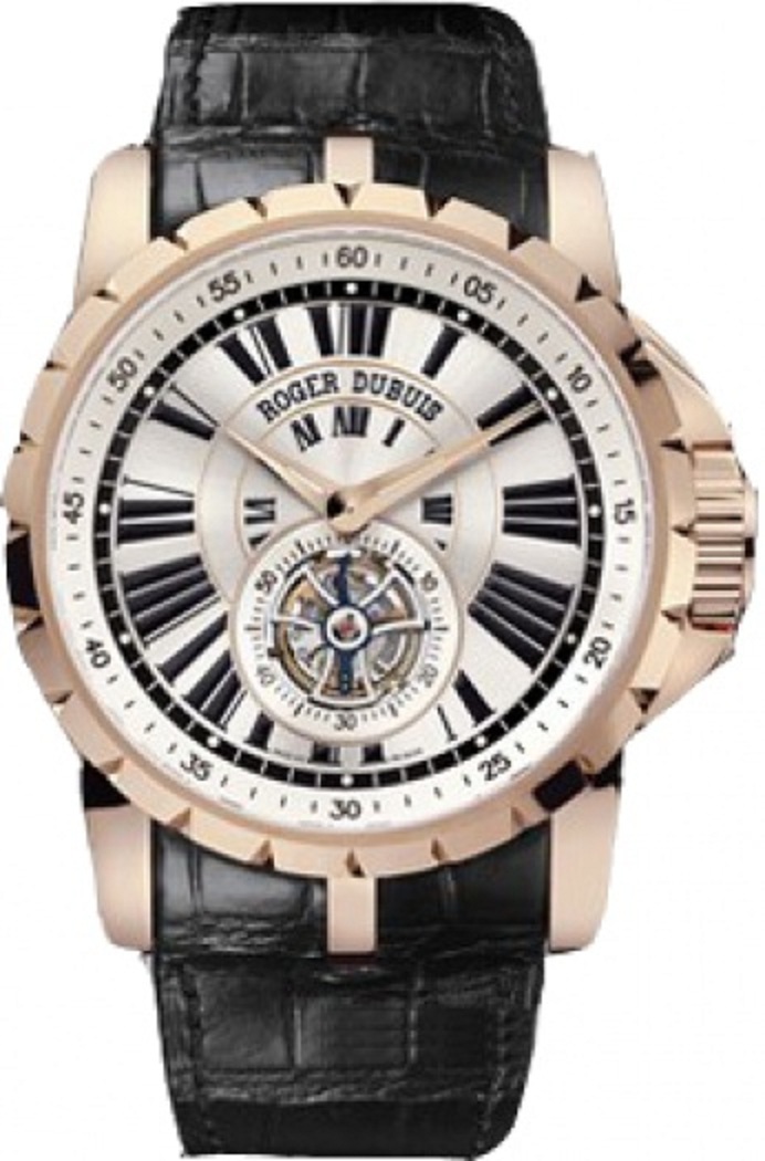 The Roger Dubuis Excalibur in 18 K Rose gold on strap. 45 mm case. Roger Dubuis has emerged as a true manufacturer who conceives, manufactures and assembles their own movements with every watch decorated with poincon de geneve finishing.